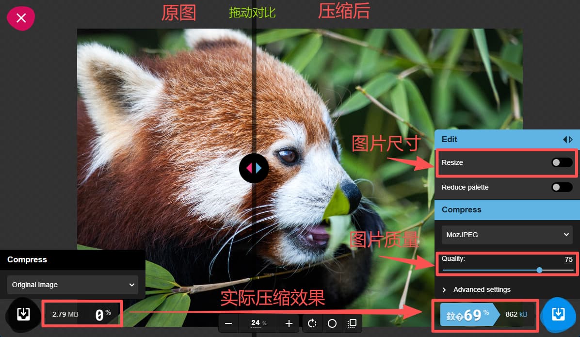 实时预览压缩效果,可以和原图直接对比细节,可以手动调整压缩比例